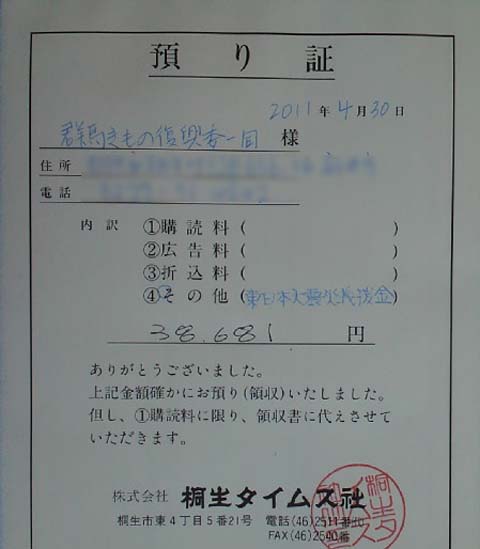 追記:さっそくダンボさんが桐生タイムズに義援金を持っていってくださいました。メールで預り証が送られてきましたのでUPさせていただきます。