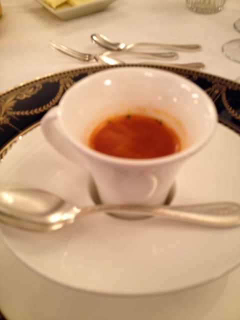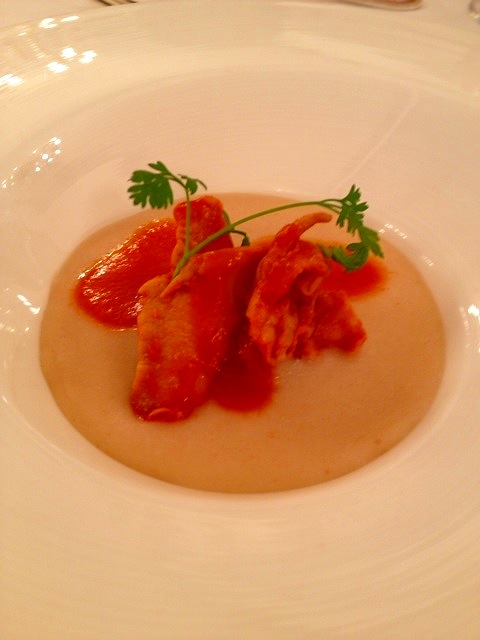 風味豊かな編笠茸のカプチーノと甲殻類のエッセンス