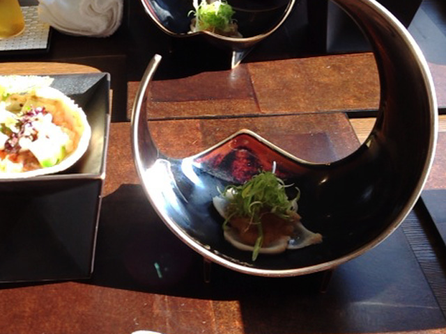 左がやさいと蟹の土佐酢あえ 右の器がフグのたたき