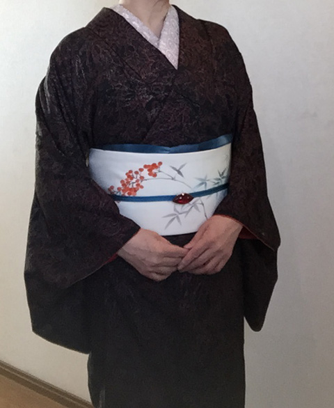 着物: 小紋 (印伝風の柄でよく見ると牡丹)